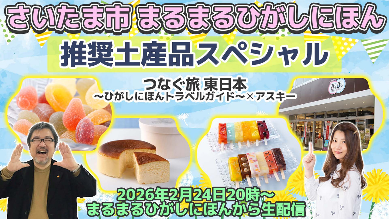 トピックス / イベント さいたま市 2/24(火)20時~生放送 【食レポ満載】さいたま推奨土産品を知って食べて飲んで楽しむ!まるまるひがしにほんスペシャル ~ つなぐ旅-東日本- ひがしにほんトラベルガイド × アスキー 生放送・第15弾:お知らせ 2026年2月24日 10:00