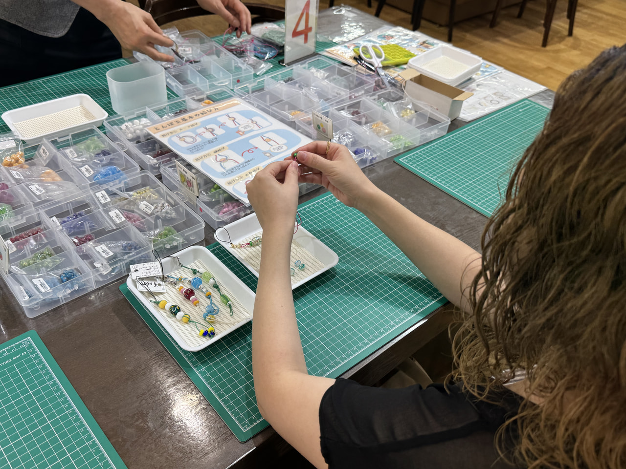 体験ではストラップ、ヘアゴム、ペンダントの3コースがあり、私はストラップコースを選択。店長の平田美奈子さんのレクチャーを受けながら作ります。