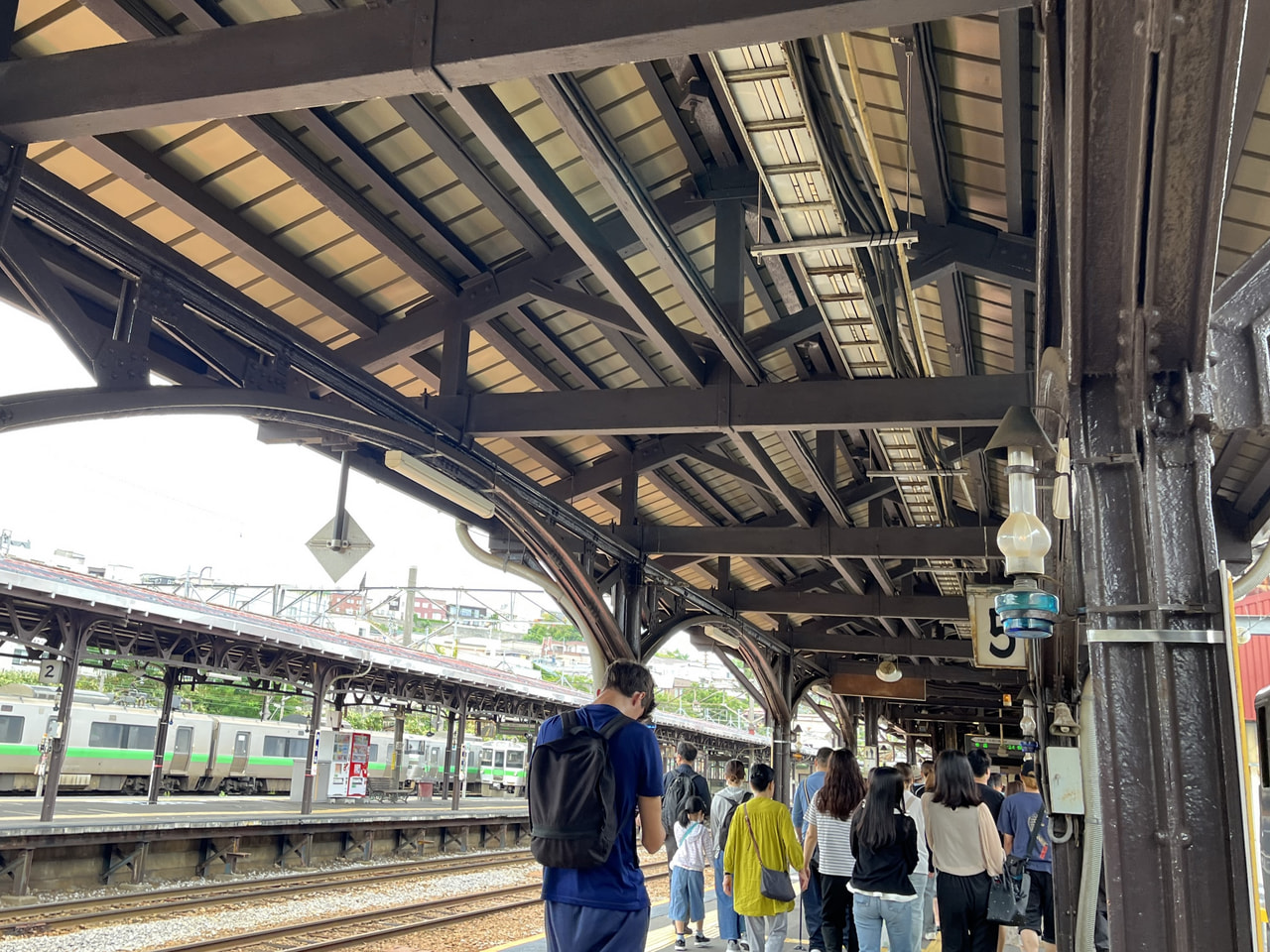 小樽駅に向かう電車はほぼ満員。といってもギュウギュウなわけではなく、席は全部埋まっていてつり革を持っている人が数人いるくらいの込み具合。ベビーカーを押す家族連れや外国人観光客の姿も多く見られました。