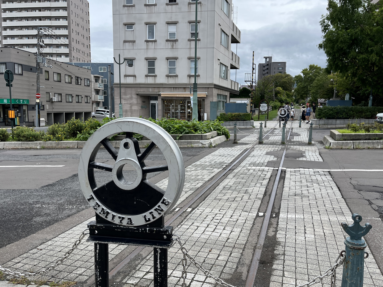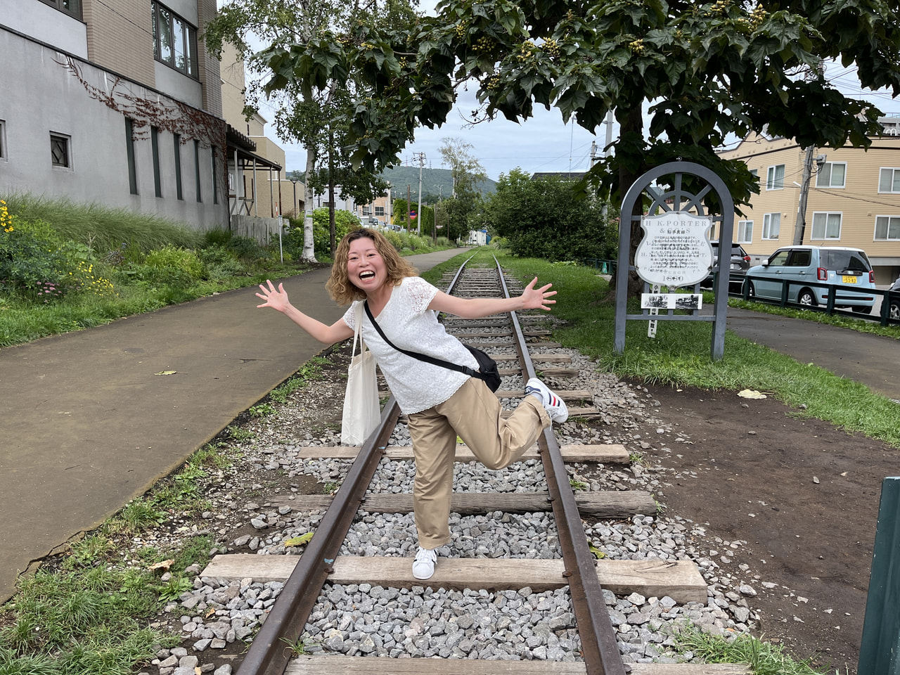 途中で線路のようなものを発見。北海道初の鉄道「官営幌内鉄道」の一部「旧国鉄手宮線」の線路で、幌内の炭山で採掘した石炭を港のある小樽市へ運ぶために敷かれた鉄道なのだそう。1962年に旅客を廃止、1985年に路線自体が廃止になっていて、現在は線路上で写真を撮ることができます。私も通りすがりのカップルに撮影してもらいました。