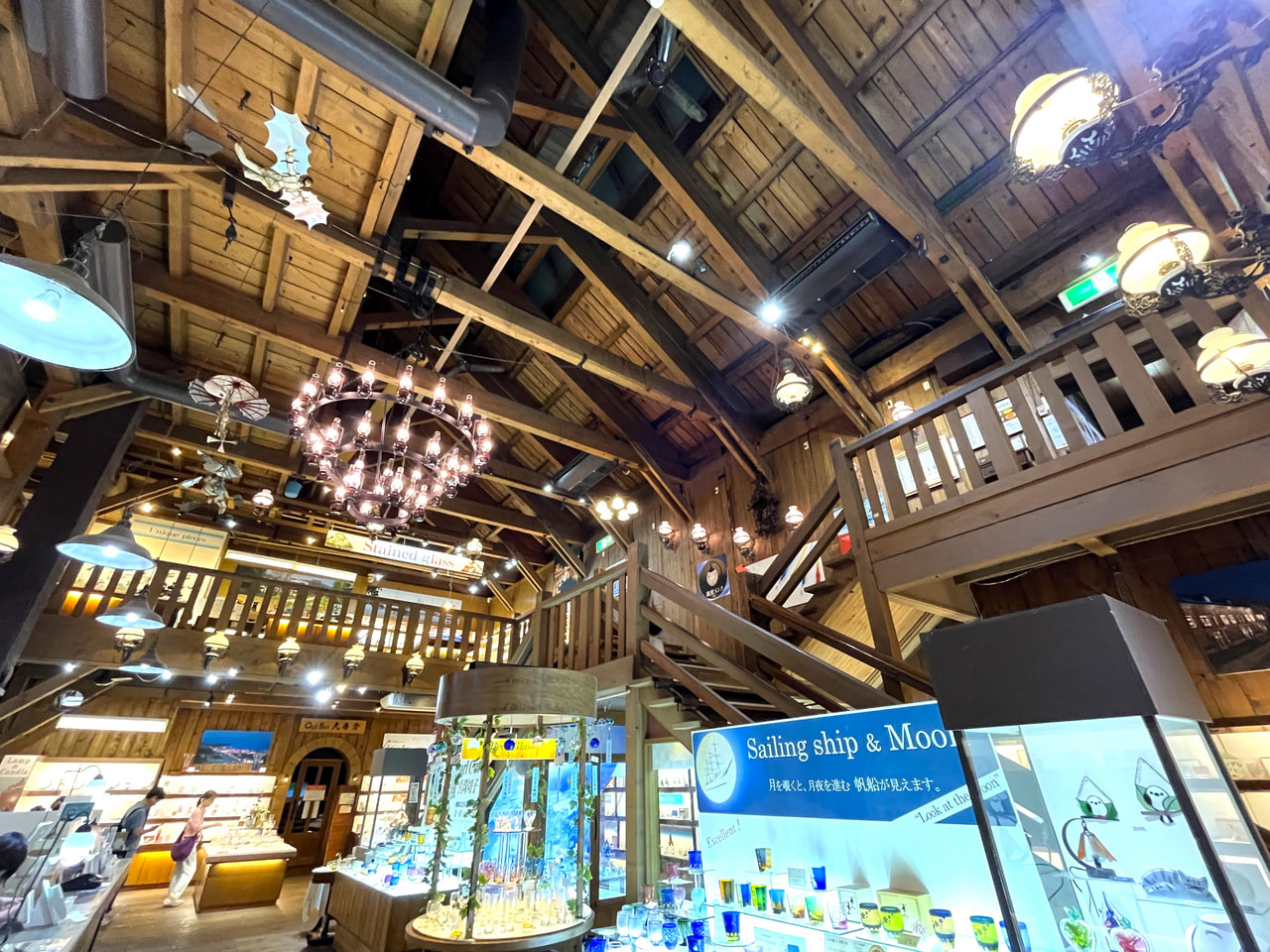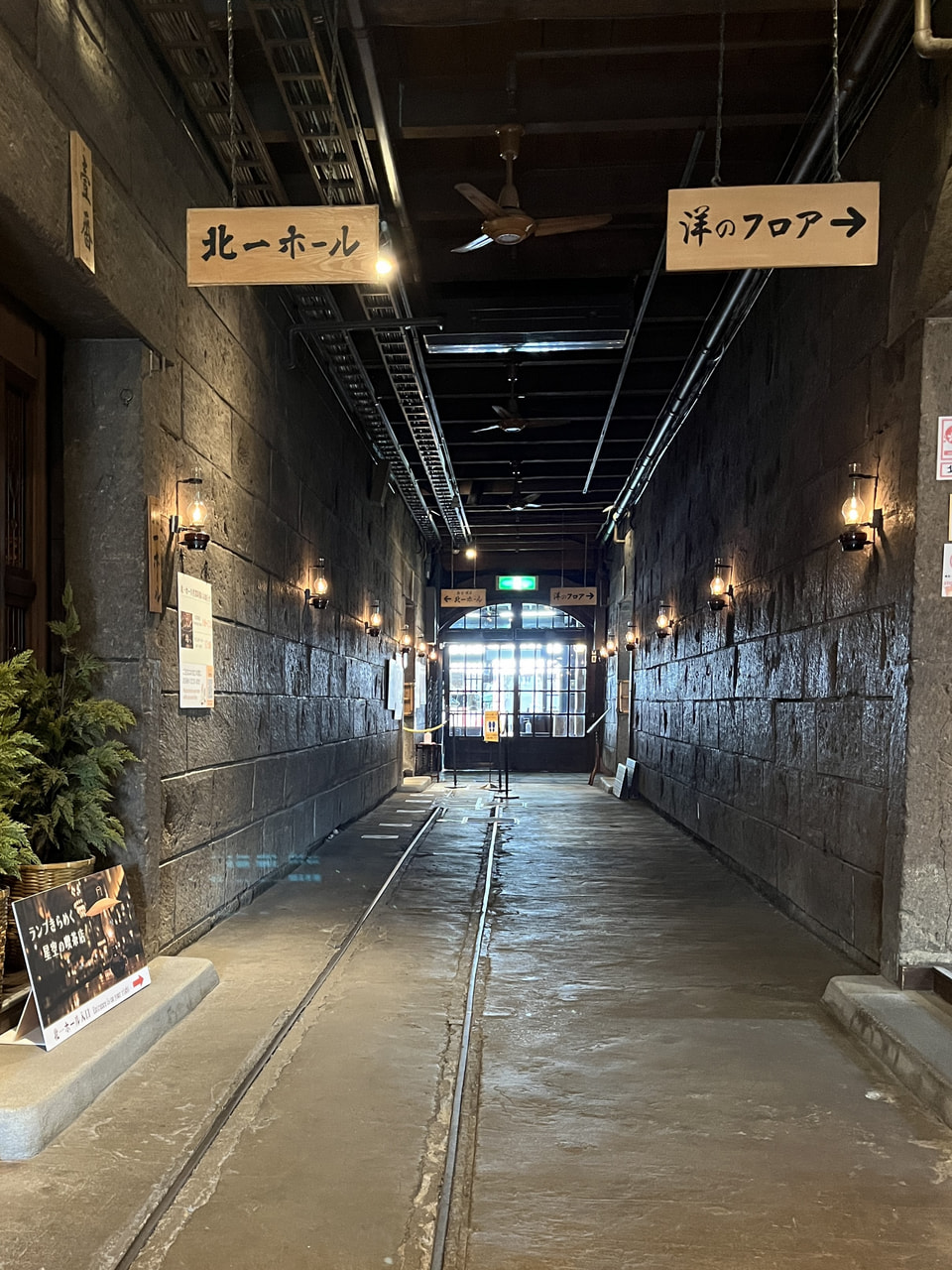 北一硝子は「北一ヴェネツィア美術館」「クリスタル館」など、複数の建物で異なるアイテムを扱っています。とんぼ玉アレンジメント体験は「製作体験工房」というところで行いましたが、「三号館」もかなりおすすめ。もとはニシンなどの加工物を置いていた倉庫だった建物で、中にはその荷運びをするためのトロッコのレールが残されています。今回は混んでいたので諦めましたが、レトロなガスランプの明かりの下でくつろげるカフェもありますよ。