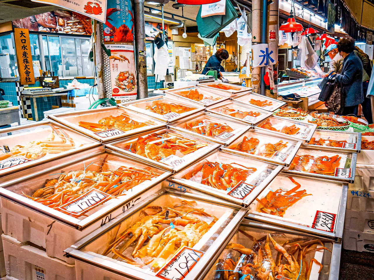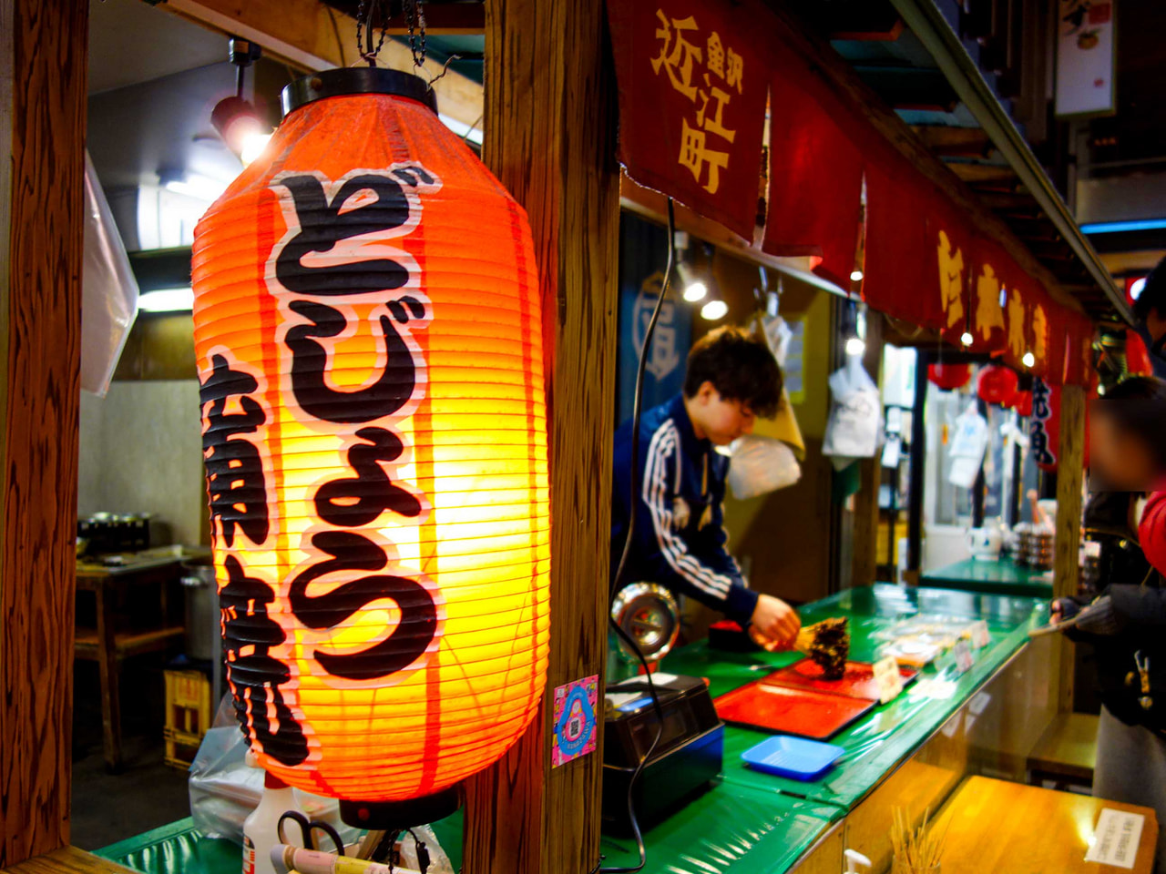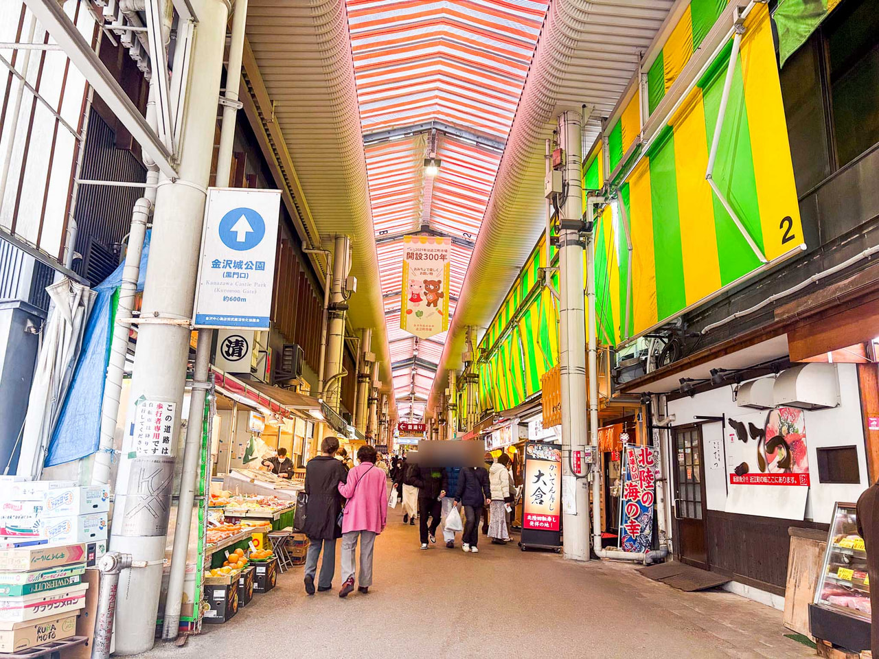 金沢駅からバスにゆられて10分ほどで行けるのが、金沢市民の台所といわれる「近江町市場」です。徒歩でも15分くらい、バスだと2駅でバス停「武蔵ヶ辻・近江町市場」に着きます。江戸時代の享保6年に始まり、金沢を城下町としていた加賀藩の御膳所だったという近江町市場には、約170軒の店舗が軒を連ね、飲食店だけで40店以上あるそうです。