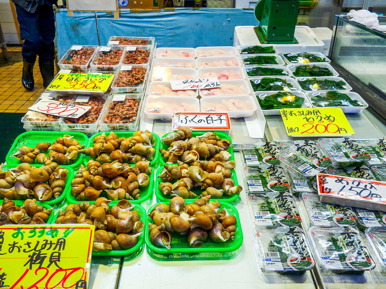 市場に足を踏み入れると、魚屋さん、八百屋さん、乾物屋さんなどが両側に並び、あちこち気になってキョロキョロしてしまいます。