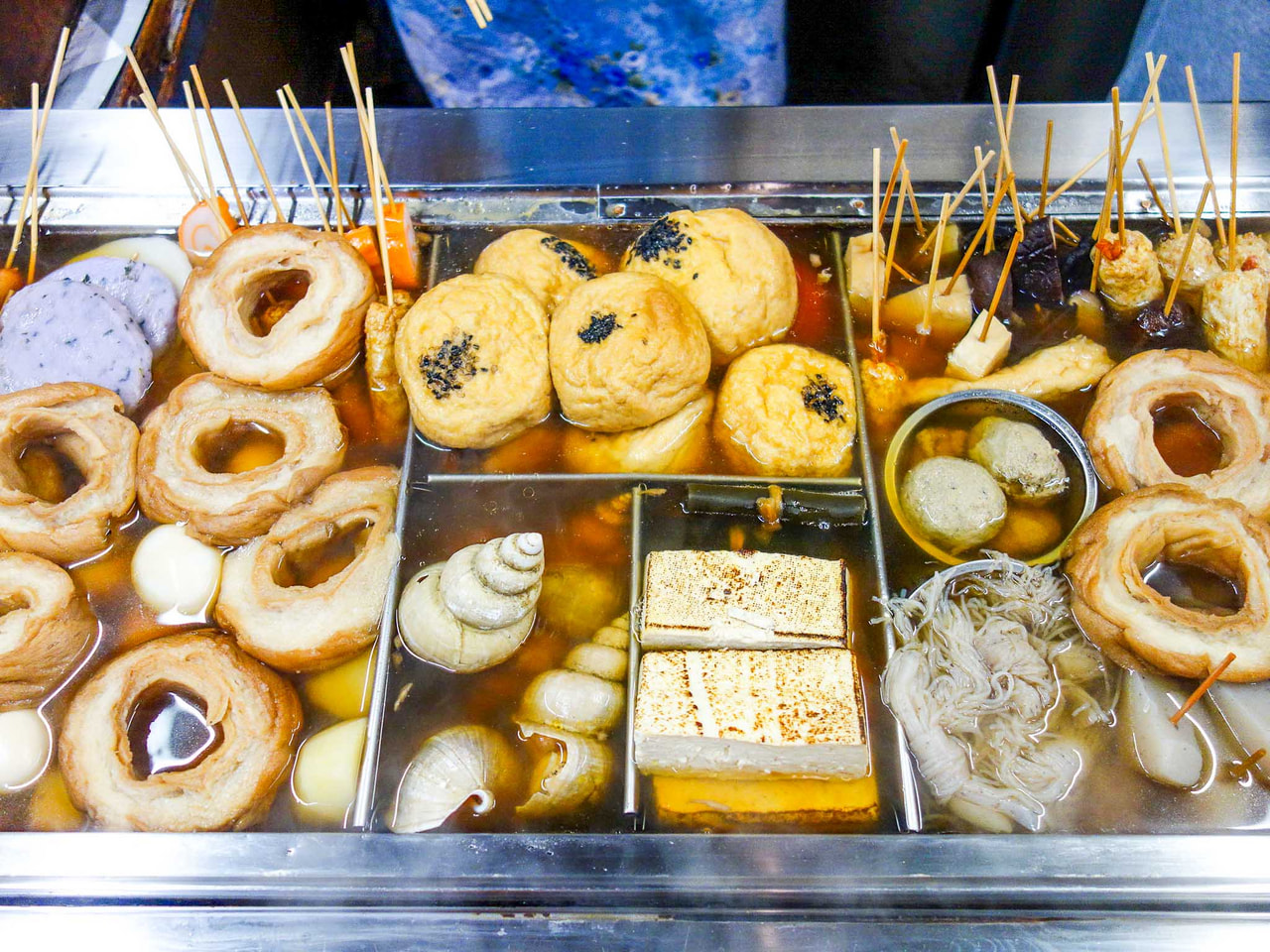 こちらでは「ひろず」と呼ばれる「がんもどき」も金沢おでんならでは。正式には「ひりゅうず」、漢字で書くと飛龍頭。関東のがんもどきは生地にニンジンやひじきが練り込んでありますが、金沢のがんもどきは龍に見立て、中にぎんなん(目玉)、ニンジン(心臓)、ごぼうと蓮根(骨)などが入ります。上にのった黒ゴマはひげ。