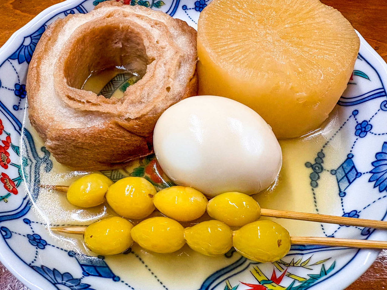 「金沢おでん」とは、普通のおでんと何が違うのでしょうか。菊一の女将・宮崎美恵子さんに聞きました。金沢おでんは地元の食材を使っていることが特徴で、車麩、梅貝、赤巻き(なると)が具材にあることが特徴だそうです。冬は香箱蟹を使った「カニ面」があるとのこと。次回は絶対に香箱蟹に時期に行くんだ……。