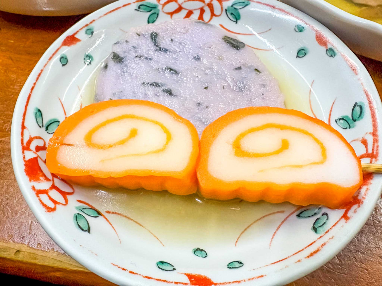 「金時草ふかし」も初めて食べました。金時草は表が緑色で裏側が紫色の「加賀野菜」で、地元ではほうれん草のように食べるそう。それを練り込んだはんぺん「金時草ふかし」、色もきれいで美味でした。