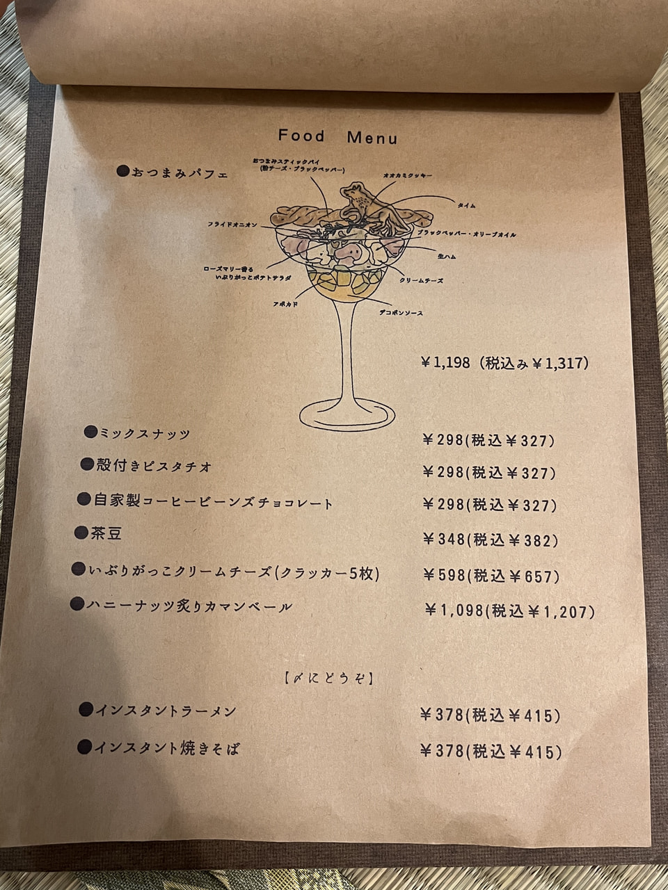 イチゴやチョコバナナなどのパフェのほか、私が訪れたときは「季節のパフェ」として梨を使ったものがありました(フルーツは季節によって異なります)。甘いもの以外にも、お酒のアテを詰め込んだ「おつまみパフェ」というユニークなメニューもあって面白い。ポテトサラダや生ハムが重ねられていて、上から順番につまむか、縦にスプーンを入れて層でつまむか悩ましいところです。お腹に余裕があれば食べたかったところですが、今回はスイーツ目的で来店したので我慢!