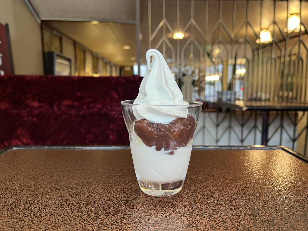 喫茶メニューのおすすめは、3人に1人は頼むという「クリームぜんざい」。卵を使わずに牛乳と生クリームで作る自家製アイスクリームはミルキーで、まるでソフトクリームのようになめらかな口当たり。もちもちの求肥と甘さ控えめの粒あんがたっぷりで、いくらでも食べられます。おなかがいっぱいだったのでSサイズをオーダーしましたが、レギュラーサイズでも良かったかも…と後悔しました。