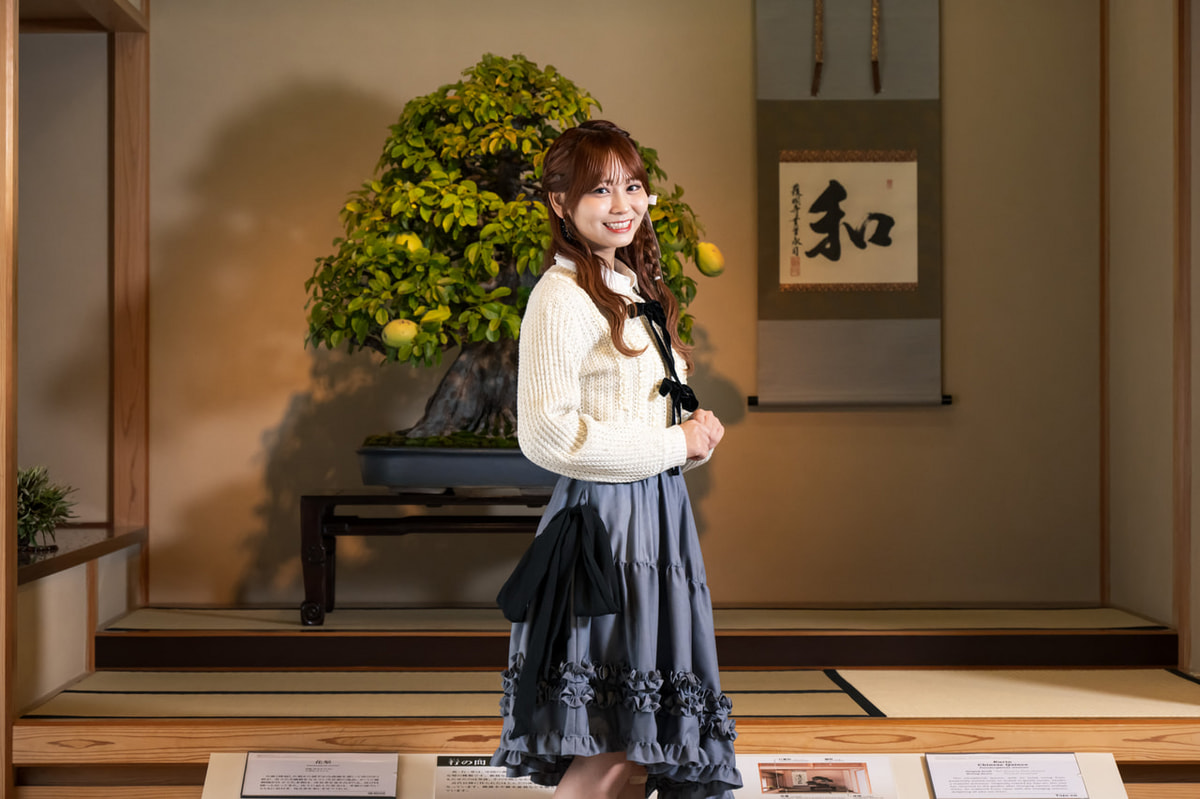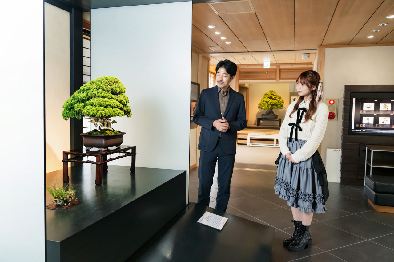 「今まで盆栽に触れる機会がなかったのですが、実際に間近で本物を見ると、その存在にとても癒されるものなんだなと感じますね。特に大宮盆栽美術館に展示されている盆栽はどれも立派で、その貫禄に圧倒されます。室内の展示は盆栽だけでなく、掛け軸や添えも美しいですね」
