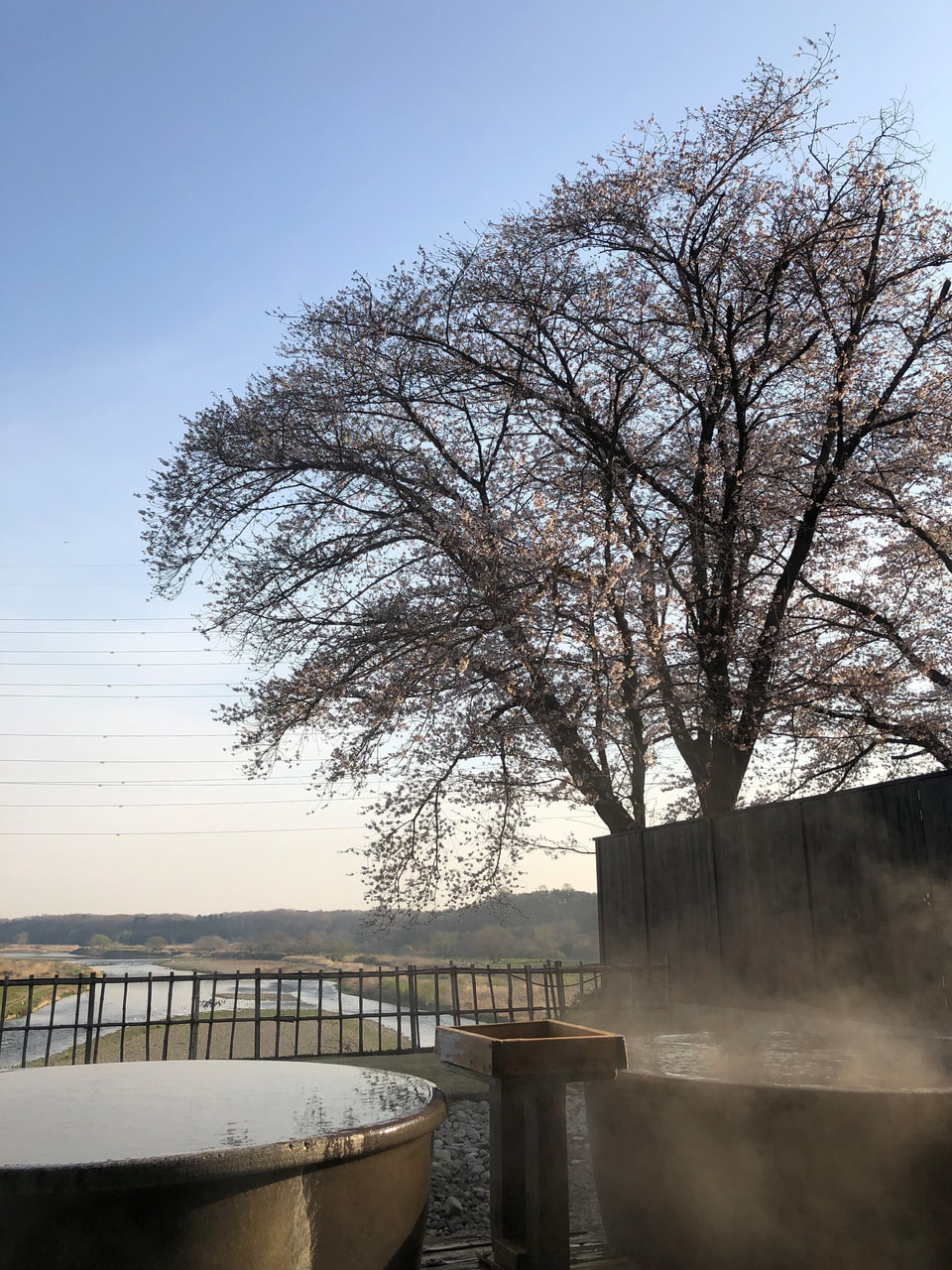 川のせせらぎに癒される男女露天風呂からそれぞれの桜を鑑賞
