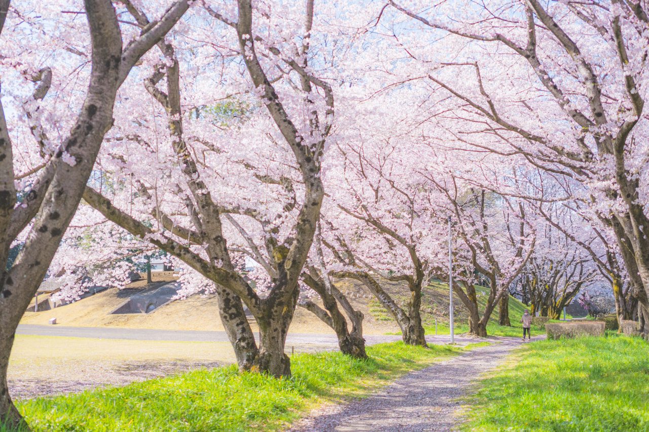 乙女かわらの里公園の北側に位置する「山下通り」は、目の前に田園風景が広がる並木道をのんびり散策しながら桜を楽しめる隠れた人気スポットです。間々田地区から乙女地区まで続く約1kmの遊歩道に、約100本のソメイヨシノと思川桜の木が並存。ソメイヨシノと思川桜の両方の桜を楽しめるので、長い期間お花見を楽しめるのもポイントです。