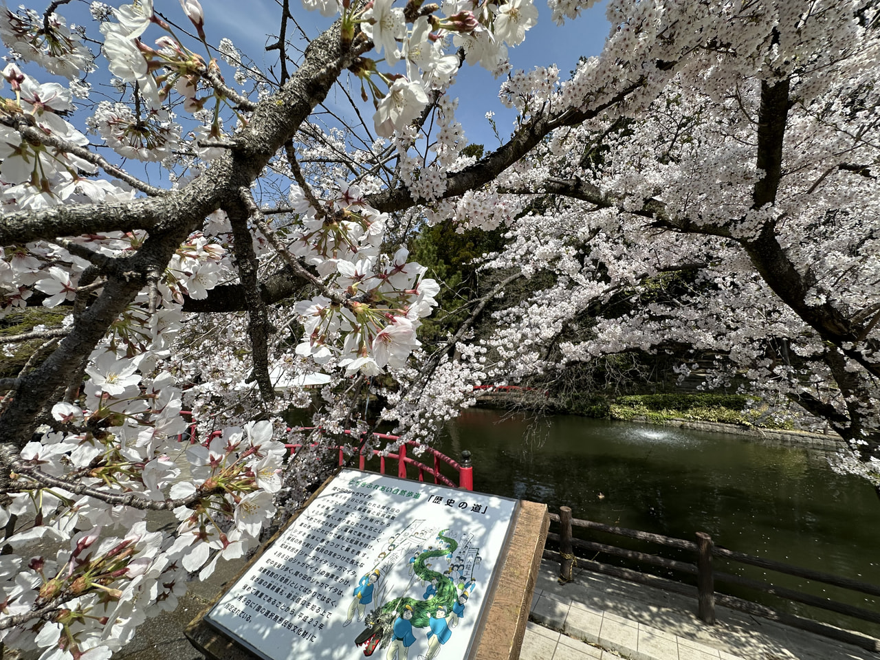 2万坪という広大な敷地の一部が公園にもなっている「間々田八幡宮」。2つの大きな池と鎮守の森がある境内にはソメイヨシノを中心に、八重桜や枝垂れ桜など約100本の桜が咲き、例年4月上旬頃に見頃を迎えます。華やかな桜に囲まれる公園内の芝生広場のほか、池に映し出される満開の桜や散り際に水面を埋め尽くす花筏(はないかだ)を眺めながら遊歩道を散策するのもおすすめ。