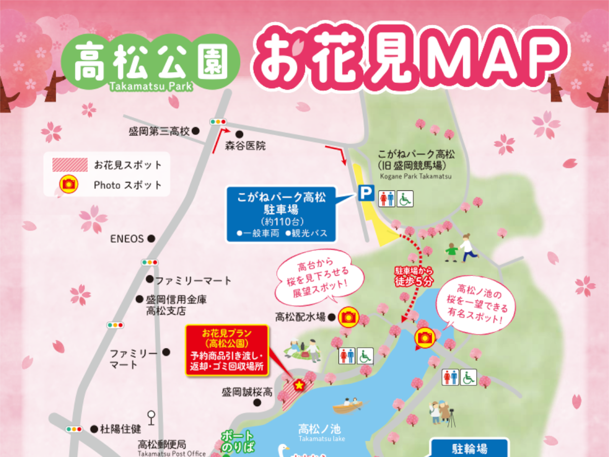 また、盛岡さくらまつりの開催期間中、盛岡城跡公園では4月12日から16日まで、高松公園では4月18日から22日まで、予約制による「手ぶらで手軽にお花見プラン」を提供する。