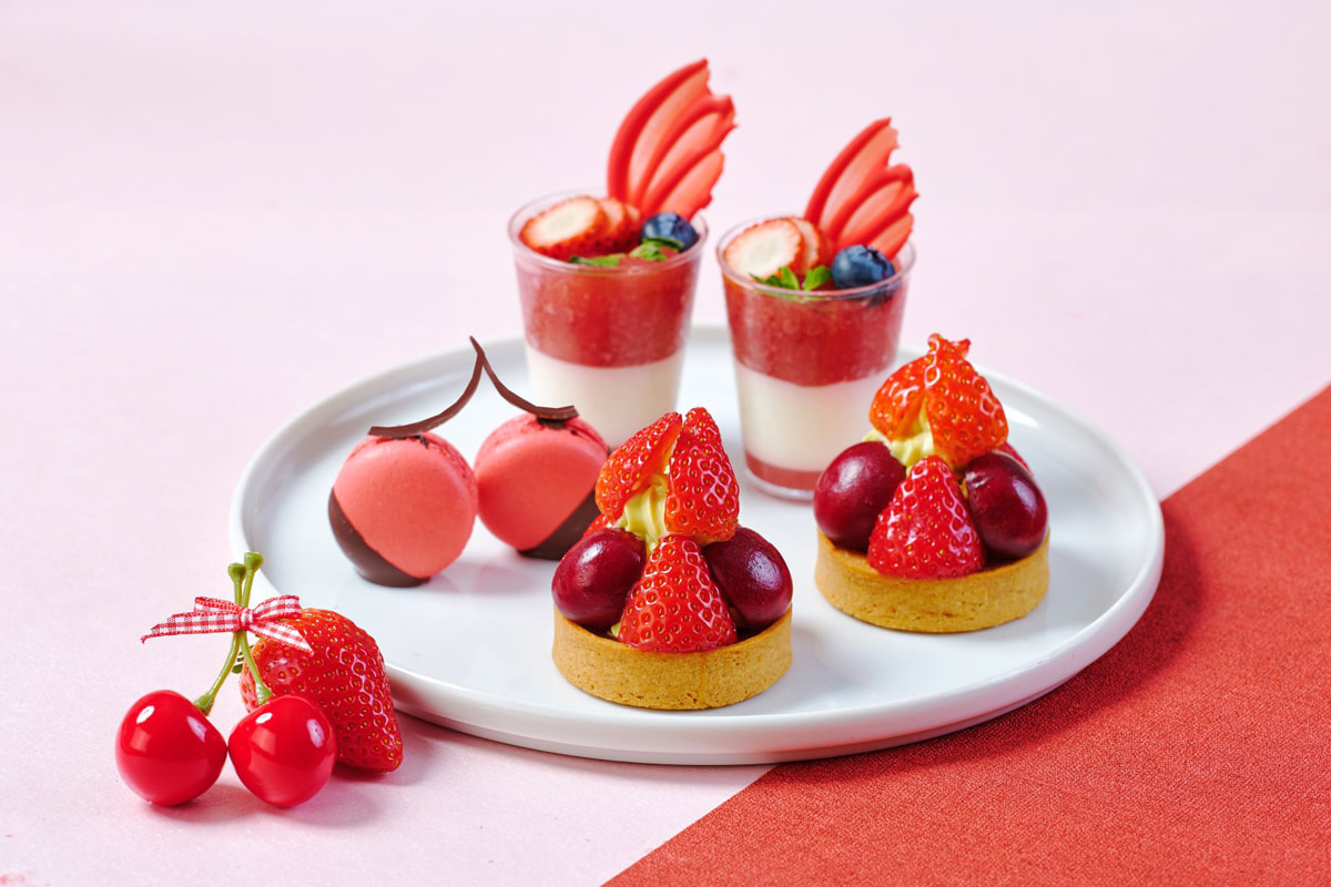 フレッシュないちごとさくらんぼを「赤い2つの宝石」に見立てた華やかなスイーツが楽しめるアフタヌーンティー。いちごのヴェリーヌやいちごとさくらんぼをたっぷり使用したタルト、チョコレートとさくらんぼの層が美しいハート型のグリオットチェリーのショコラなど、各スイーツに“いちご”と“さくらんぼ”の要素を取り入れている。
