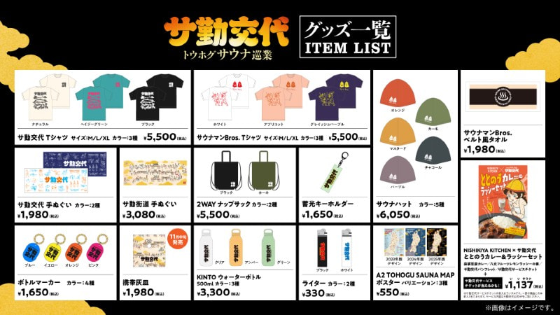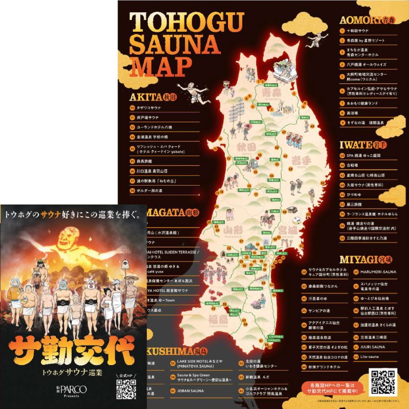 2023年5月と2024年6月に開催し、延べ1万人以上を動員して大好評を博したイベント。第1弾と第2弾では「トウホグサウナ大市」と題し、東北各温浴施設のオリジナルグッズや最新サウナグッズを集約した展覧会だったが、本イベントでは仙台PARCOを皮切りに東北各県の人気サウナ・温浴施設・イベントへ巡回する「サ勤交代」となる。オリジナルグッズを中心に販売するほか、巡回する東北各県のサウナ・ 温浴施設とのコラボグッズも追加制作予定という。