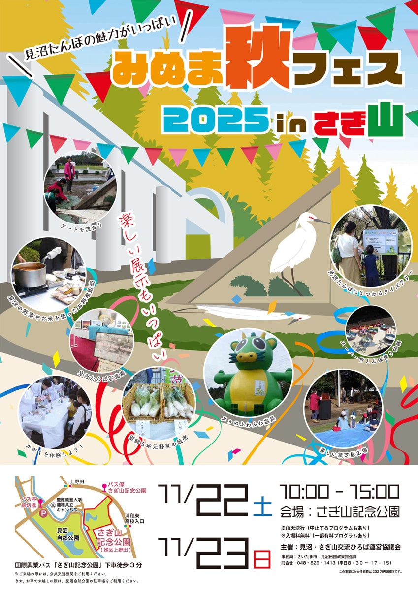 埼玉県さいたま市緑区のさぎ山記念公園にて、「みぬま秋フェス2025 in さぎ山」が11月22日・23日に開催される。