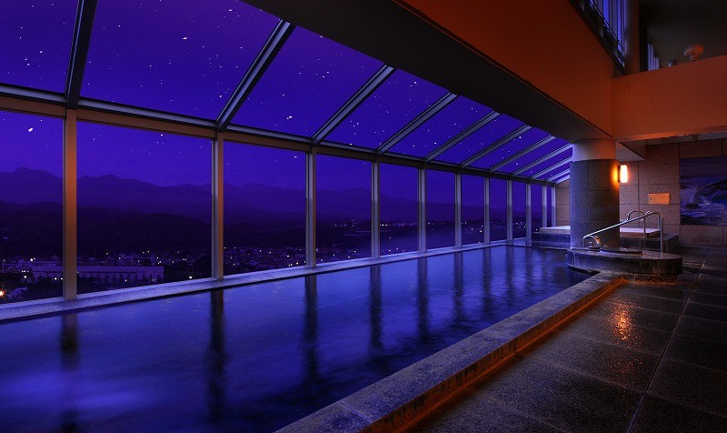 同館では、5階の展望大浴場・半露天風呂は、昼は雪化粧をまとった蔵王連峰、夜は満天の星空を楽しめるほか、昭和47年9月に開湯した黒沢温泉(泉質:ナトリウム-硫酸塩温泉)の無色透明の優しい湯を堪能できる。