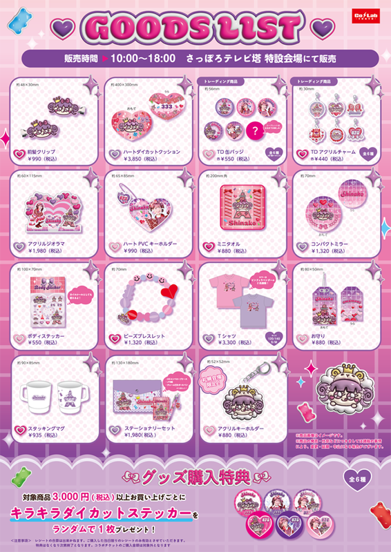 限定グッズとして、しなこの撮りおろし写真と新規イラストを使用した限定コラボグッズを販売(全15アイテム25種類)、札幌会場限定グッズも販売。さらに期間中は1会計3000円ごとに「キラキラダイカットステッカー」1枚をプレゼント。