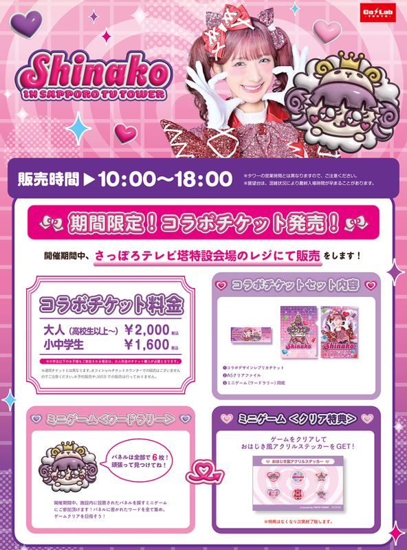 コラボチケットは、館内に隠れたしなこちゃんのパネルを探すワードラリーが楽しめ、本イベント限定クリアファイルやコラボデザインのレプリカチケット付き。ワードラリーは、さっぽろテレビ塔館内(1階~展望台)に設置されたパネルに書かれたワードをすべて集め、チケットに付属するミニゲーム(ワードラリー)用紙に記入して特設会場へ持っていくと「おはじき風アクリルステッカー」がプレゼントされる。