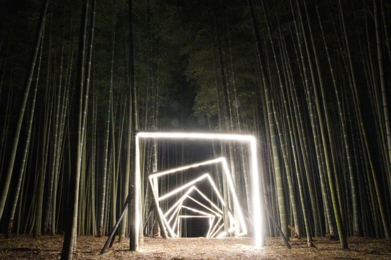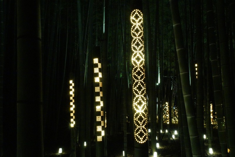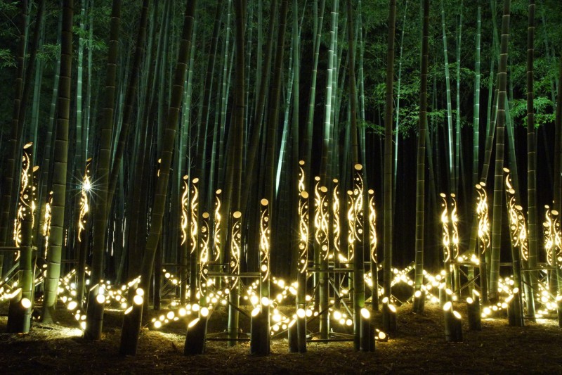 漆黒の暗闇を通り抜けた先には荘厳な竹林風景が広がり、光に照らしだされ切り取られたその竹林に息を呑むほどの光と音の演出と、無数の竹灯りの優しい光が来場者を迎える。