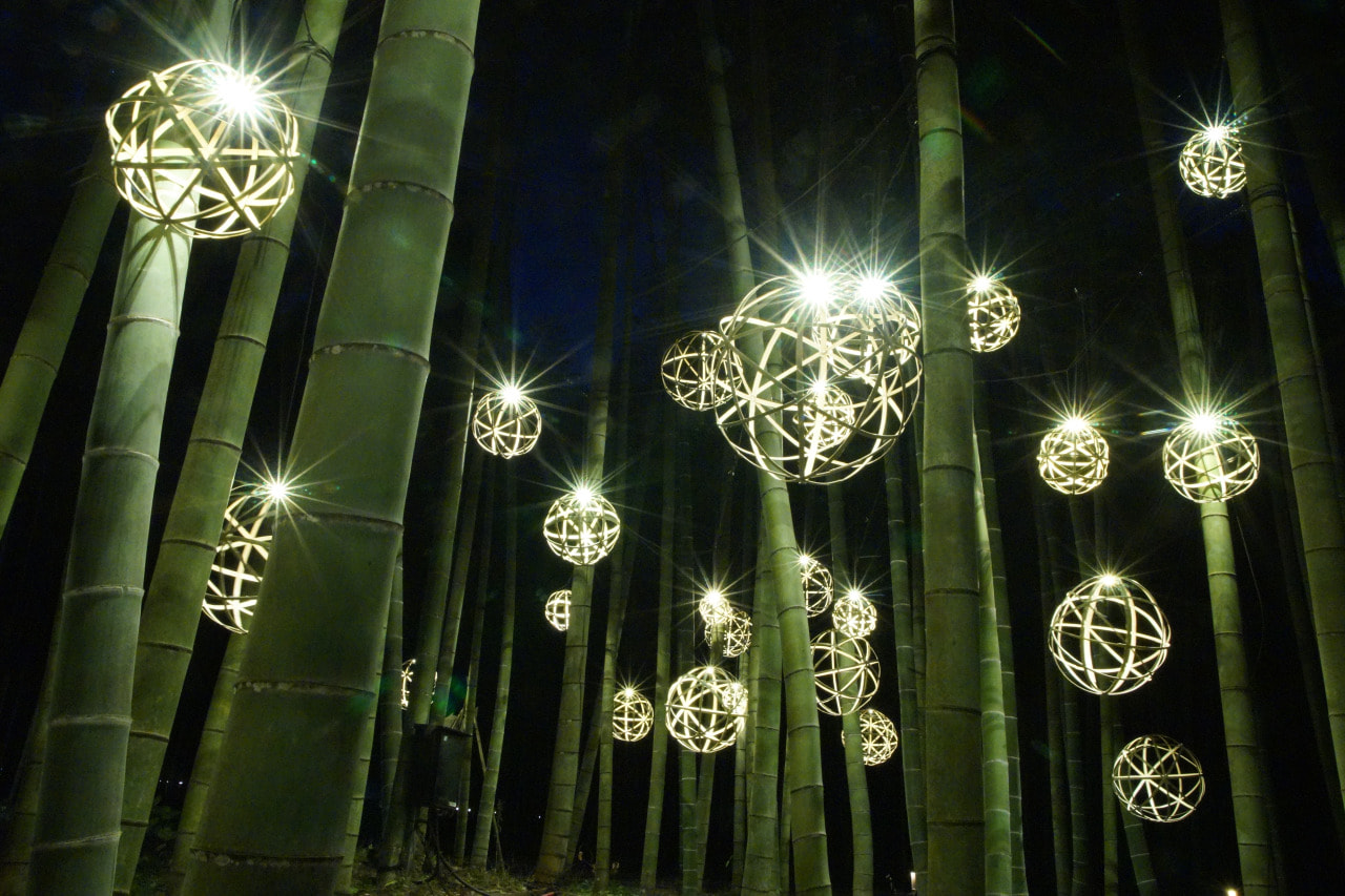 圧巻の竹林を照らすさまざまな光の演出に加え、竹あかりアーティスト CHIKAKEN と若山農場のスタッフが総力を挙げて完成させた灯りの数々、そして竹アーティストの三橋玄氏による「風」をテーマとした作品などが見どころという。