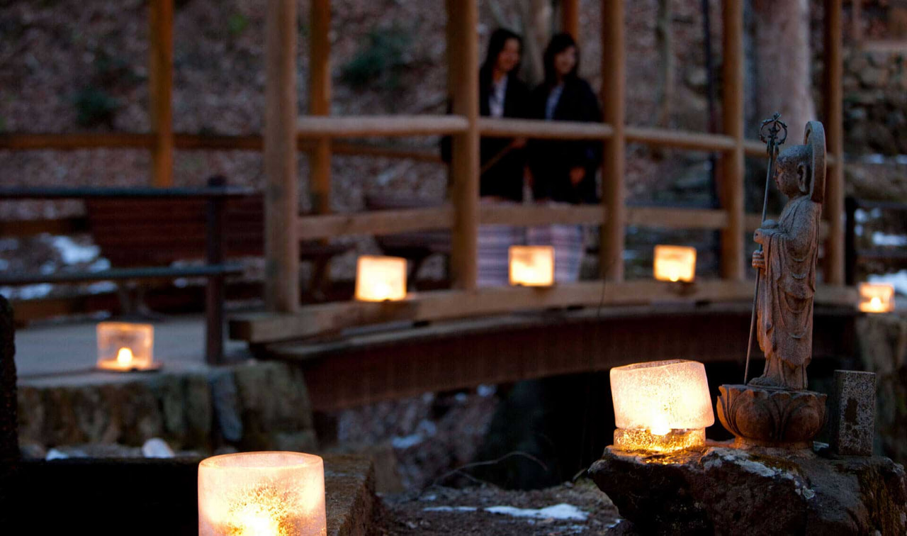 本イベントは氷で作られた「氷灯ろう」に蝋燭をともして飾る幻想的なイベント。鹿教湯温泉の由来となった鹿の姿で猟師に出湯を教えたという文殊菩薩が祀られた文殊堂から、現世と神の世界を結ぶといわれた五台橋、鹿教湯温泉街へと続く道筋が照らされています。