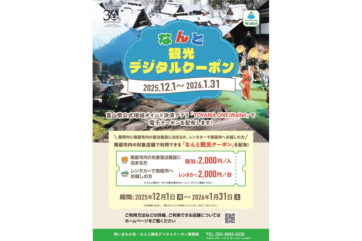 南砺市では、南砺市と岐阜県白川村にまたがるユネスコ世界文化遺産「白川郷・五箇山の合掌造り集落」が今年度世界遺産登録30周年の節目を迎える。これを機に市内対象宿泊施設への宿泊または南砺市へレンタカーで訪れる人を対象としたデジタルクーポンを配布するキャンペーンを開催。