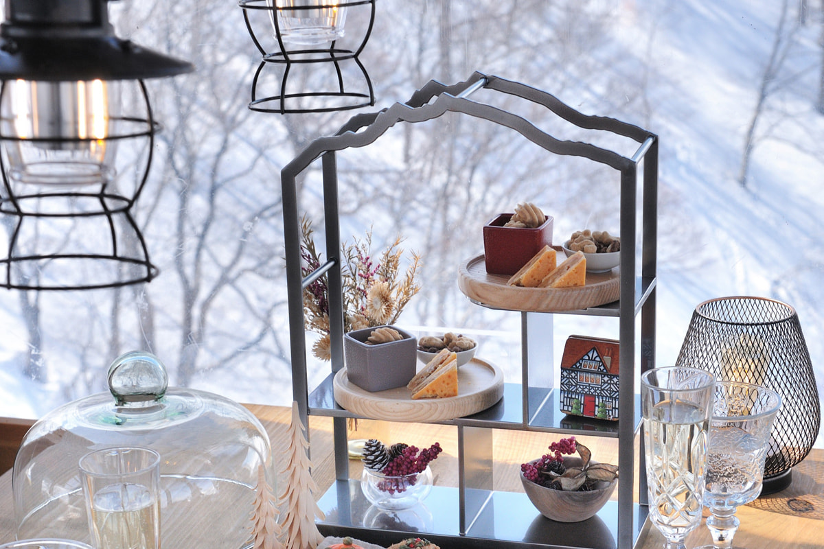 車内では、チロル地方の食文化に着想を得たフィンガーフードを提供する。サラミやリエット、チーズのほか、スイスの伝統菓子エンガディナーをイメージしたスイーツを用意し、谷川岳の稜線を模したスタンドで提供する。ドリンクにはスパークリングワインや摘果りんごを使ったりんごジュースが含まれる。