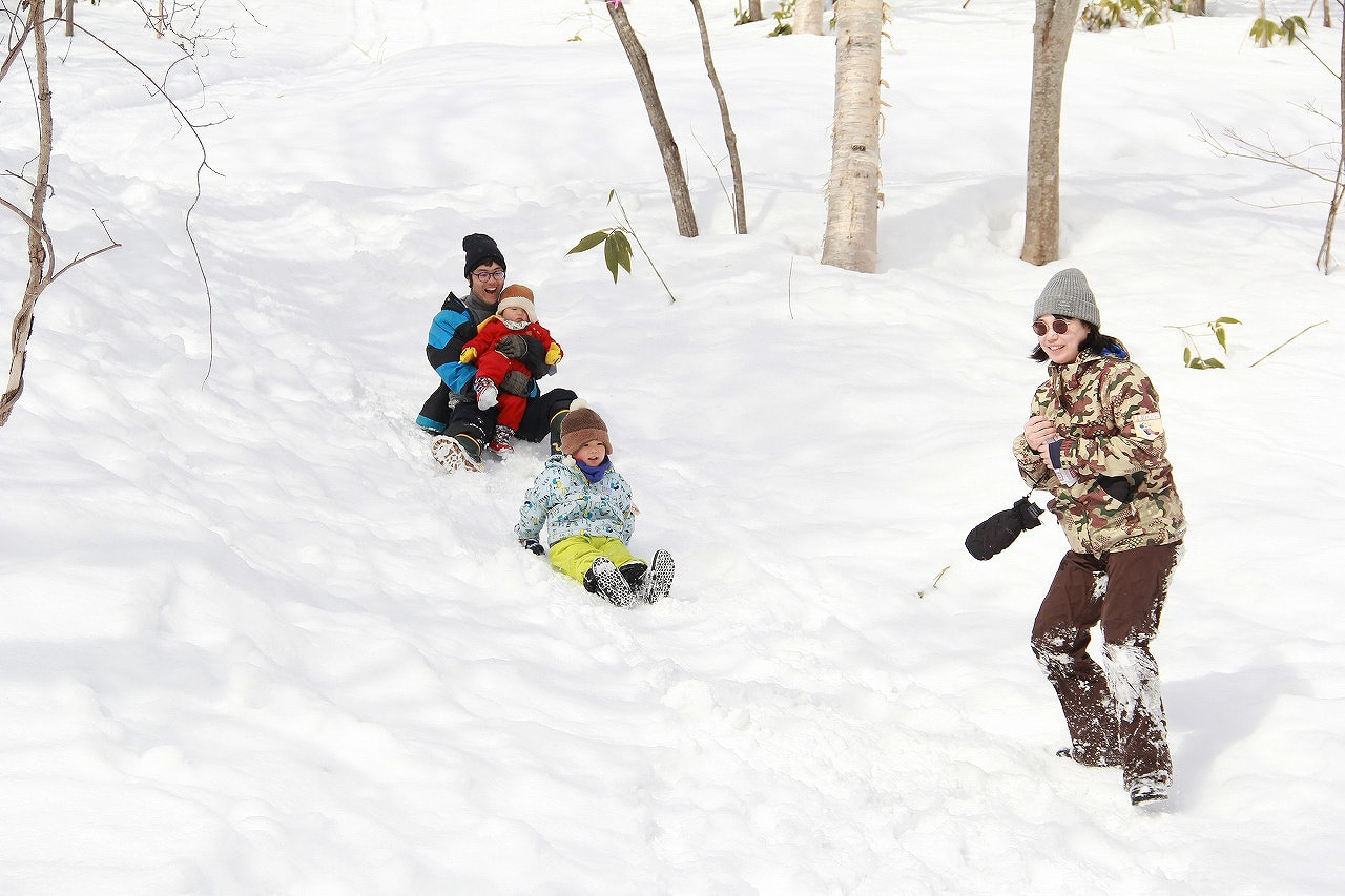 滝野の森ゾーンでは、未圧雪の森の中で自由に雪遊びができ、スノーシューや尻すべり、雪遊びグッズの無料レンタルが人気を集めている。