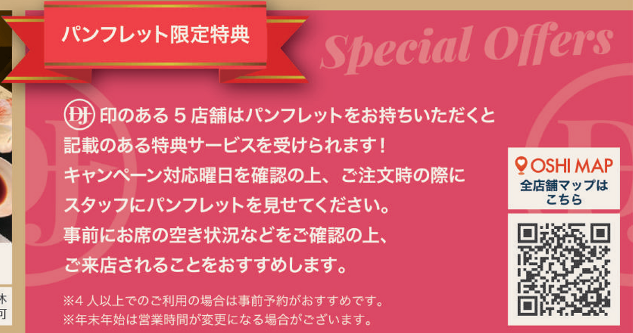 さらに嬉しいのが、公式パンフレットを提示するだけで受けられる特別サービス。キャンペーン参加店舗のなかでも5店舗の対象店舗で公式パンフレットを提示すると、お店ごとの特別サービスが受けられます。
