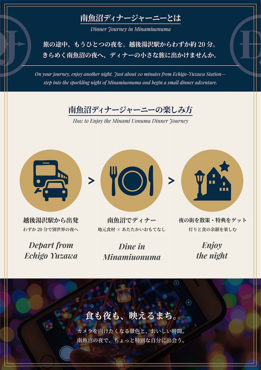 「南魚沼ディナージャーニー」は、2025年12月19日(金)〜 2026年2月28日(土)の期間開催され、冬の南魚沼で地元グルメや夜の街歩きを楽しめるキャンペーンです。