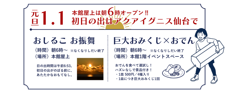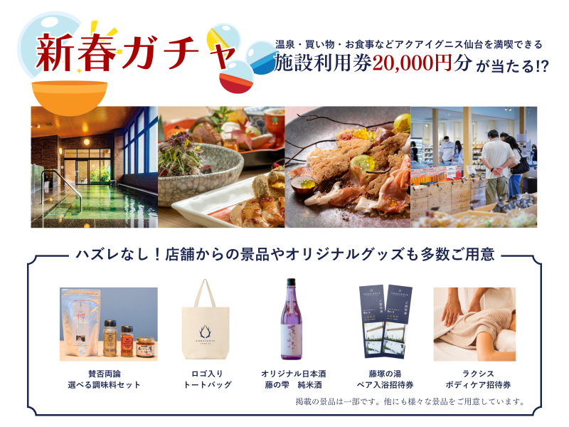 仙台市若林区の「アクアイグニス仙台」は2026年1月1日より、新春フェアとして「初日の出」営業や豪華景品が当たる「新春ガチャ」や初売りを開催する。