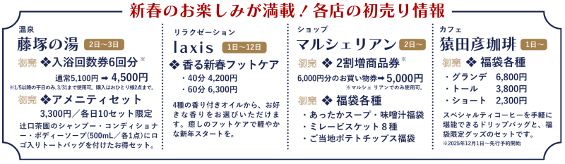 また、2026年1月2日~4日は施設内店舗で利用可能な「施設利用券2万円分」などの豪華景品が当たる「新春ガチャ」を開催するほか、施設内各店では袋などお得な商品や特別メニューを用意。