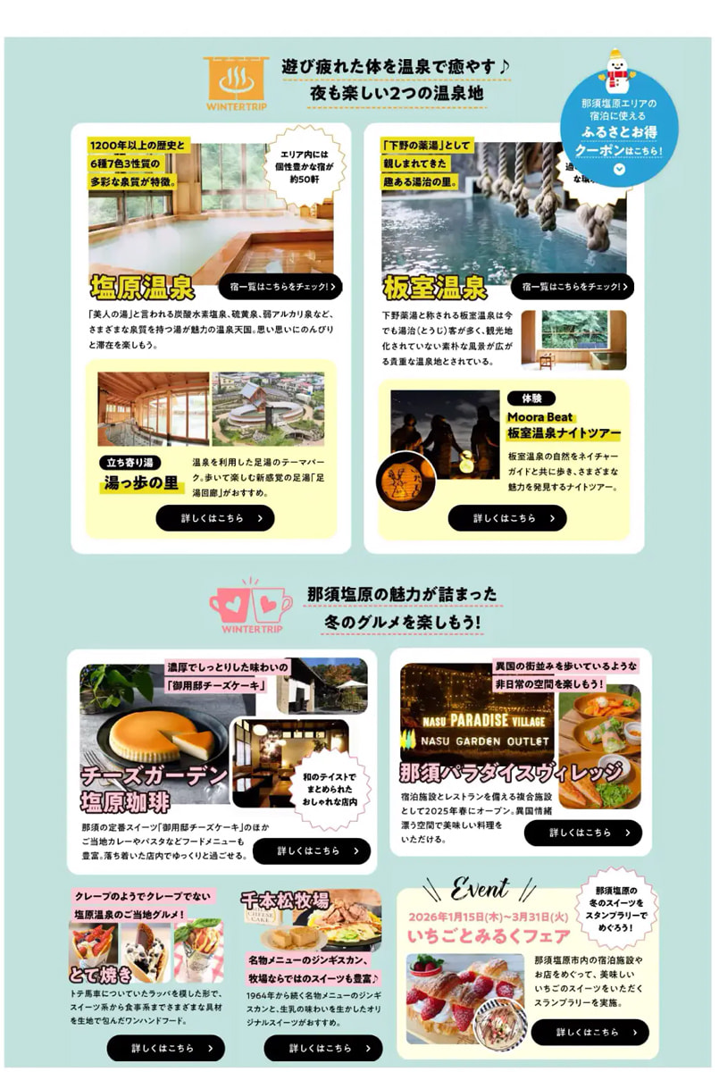 那須塩原市観光局は2026年1月5日~2月28日の期間に、「雪も温泉も満喫! 冬の那須塩原」ウィンターキャンペーンを開催する。那須塩原市の宿泊予約に利用できるクーポンを配布している。