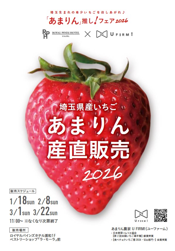 ロイヤルパインズホテル浦和は、埼玉県産プレミアムいちご「あまりん」を使用したスイーツフェア「『あまりん』推し!フェア2026」を開催している。フェアは5月中旬まで展開予定で、ホテル内の複数店舗や特設会場で関連企画を実施する。