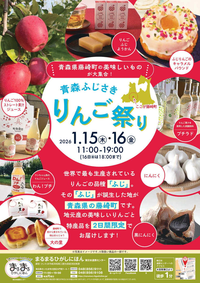 埼玉県さいたま市の情報発信拠点「まるまるひがしにほん(東日本連携センター)」は1月15日・16日、大宮で「青森ふじさきりんご祭り」を開催する。