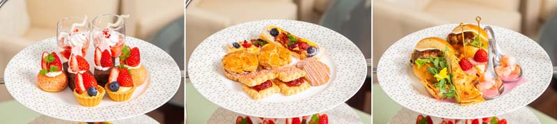 「ストロベリーアフタヌーンティー」は、シェフ、パティシエ、ブーランジェが、それぞれの専門分野から「いちご」の魅力を引き出した珠玉のティーセット。趣向を凝らした全12種類のスイーツやセイボリーが、3段スタンドを華やかに彩る。