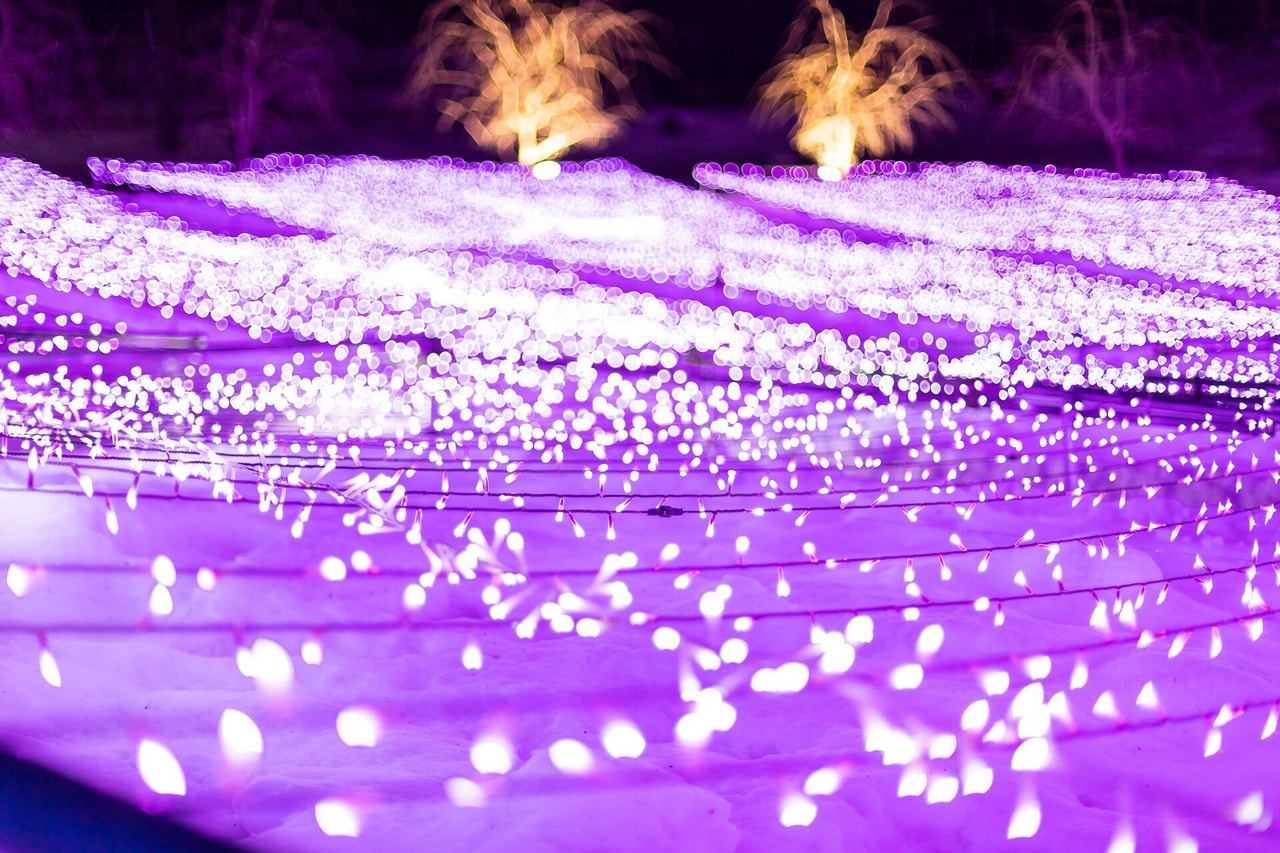 岩手町で開催される「冬の花畑」は、ラベンダー畑を再現した一面の紫の光が、息を呑むほど幻想的な世界。雪の上に広がる紫の輝きは、この時期、ここでしか出会えない絶景です。