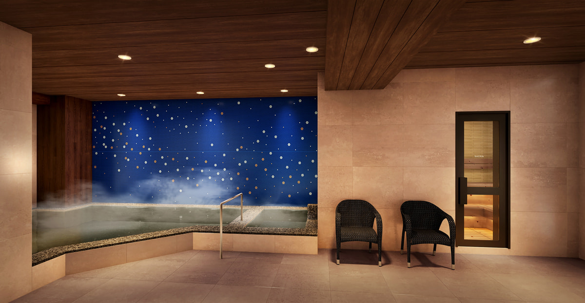 客室は「イーハトーブの森に佇む客室」をテーマに、木の温もりを感じる素材や暖炉を設えたデザインとした。大浴場にはサウナを備え、「銀河鉄道の夜」をモチーフにした星空を思わせる空間を演出している。レストランとラウンジは、向かい合わせの電車席をイメージしたベンチシートなどを配置し、24時間利用できるフリースペースとして整備している。