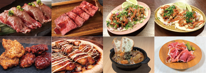 - MEAT【ステーキ&グリル マーベリックス】:自家製オニオンソースのリブステーキ、ワイルド!ガリバタ牛ステーキ/【韓国焼肉4시〜sisi〜】:ネギ盛り牛タン、青唐辛子味噌牛タン/【玉川精肉店】:塩とわさびで食べる国産牛レアカツ、肉屋のゴロゴロメンチカツ/【Mrs.hamburger】:武州和牛使用!特製グルメバーガー(チェダーチーズ/てりやき/タルタル)/【川越薪火料理 in the park】:国産牛もも肉の薪火スモークグリル、薪焼き牛のラグーパスタ/【ハラミ専門酒場ハラミちゃん】:牛ハラミちゃんステーキ(生黒胡椒&岩塩/赤ワインソース)、牛ハラミのすじ煮込み/【T&G Kitchen】:旨辛フライドチキン(ヤムニョム/ハニーマスタード)、特製チキンピザ(ヤムニョム/照り焼きマヨ)/【肉割烹 喰心】:特選黒毛和牛 極上赤身ステーキ、和牛ホルモン 味噌焼き/【CIELO'S MEXICAN】:ビーフタコス、チキンタコス/【神田 タンだけ】:熟成厚切り牛タン 特製塩だれ、柔らか牛タンゴロゴロカレー煮込み/【石垣島きたうち牧場】:厳選国産牛 でか肩ロース鉄板焼き、厳選国産牛 切り落とし焼肉/【WORLD DINER】:黒毛和牛炙り肉寿司、北海道産牛のローストビーフ/【BISTRO THE MEAT】:三元豚のベーコンステーキ、スペイン産ハモンセラーノ/【ライスSTAND】:ガーリックライス、コムタンスープ、ライス