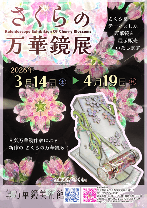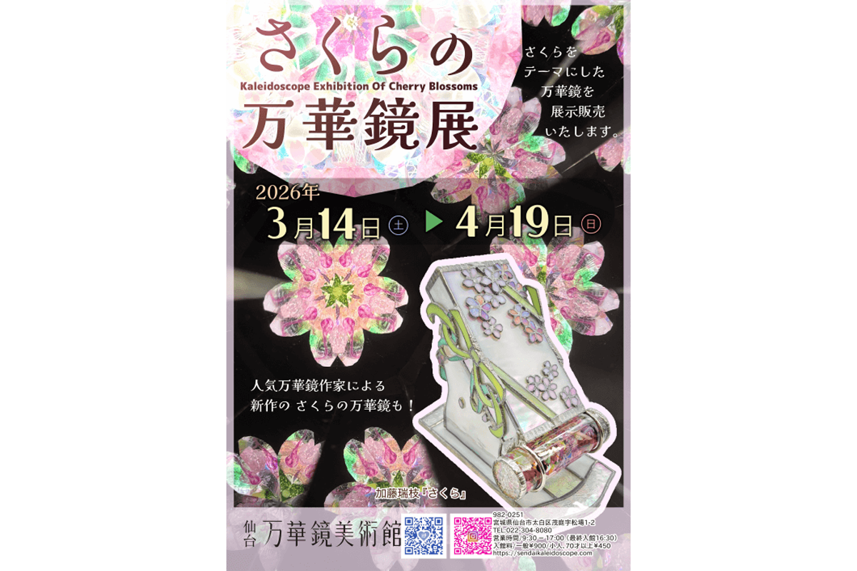 トピックス / イベント 仙台市 万華鏡の中に春を感じてみよう 「さくらの万華鏡展」4月19日まで開催中 2026年3月16日 12:00 更新 仙台万華鏡美術館では4月19日まで、「さくらの万華鏡展」が開催中。収蔵品を含めた選りすぐりの「桜の万華鏡」を展示し、人気作家の新作も展示販売。ひとあしはやい春を感じることができる。DATA開催期間:~4月19日開館時間:9時30分〜17時(最終入館 16時30分)開催場所:仙台万華鏡美術館(宮城県仙台市太白区茂庭字松場1-2) 関連リンク イベント情報 仙台万華鏡美術館