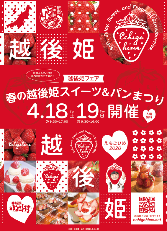 越後姫フェアは県内各地からスイーツ店やベーカリー、農産物直売所などが出店し、越後姫を使用した多彩な商品が一堂に集結、昨年開催されて多くの来場者で賑わったイベント。さらに今年は「春の越後姫スイーツ&パンまつり」と題し、内容をさらにパワーアップ。 越後姫を贅沢に使用したスイーツやパンの販売のほか、採れたて越後姫の販売や来場者参加型企画といった体験型コンテンツも実施する。