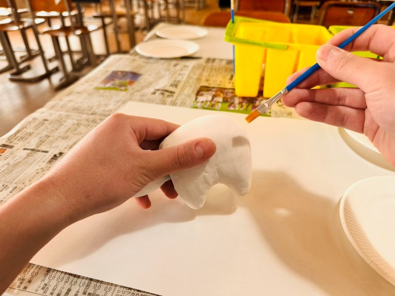 絵付けを体験では、赤べこに新幹線の色や車体の模様を描き、絵付けした赤べこは当日持ち帰ることができる。