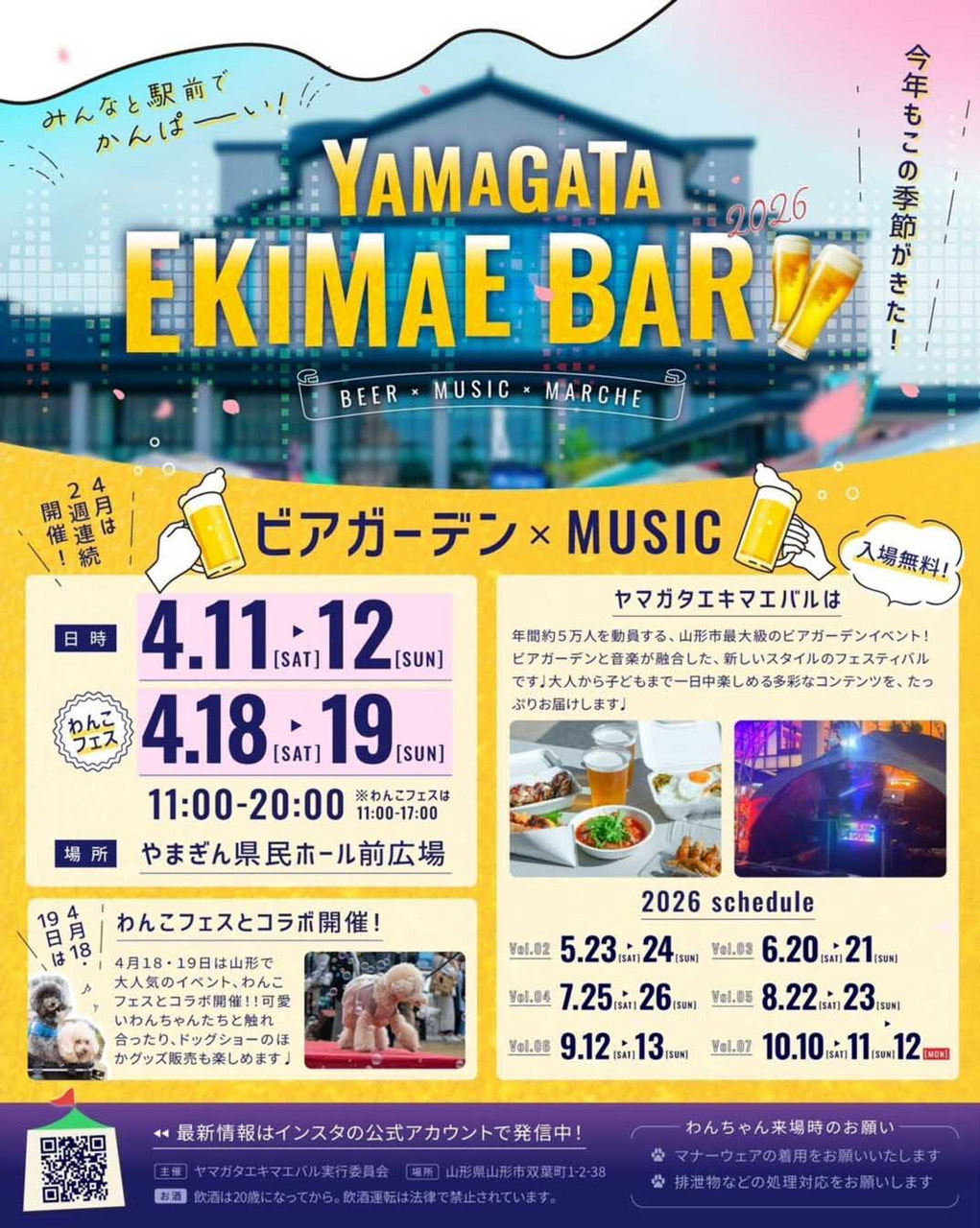 山形県山形市のやまぎん県民ホール前広場にて「YAMAGATA EKIMAE BAR(ヤマガタエキマエバル)2026」が開催されます。開催日は4月11日(土)、12日(日)、18日(土)、19日(日)の4日間です。
