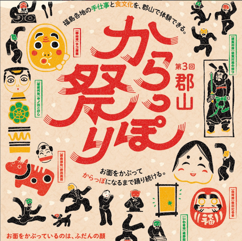 今年3回目のからっぽ祭りは郡山市の中心市街地を舞台に、福島県内工芸品のワークショップ、だるまや赤べこの絵付け体験のほか、工芸品販売など福島県内の工芸とコラボした企画が予定されています。また、工芸の産地にまつわる食も用意されており、キッチンカーなどが会場に並びます。