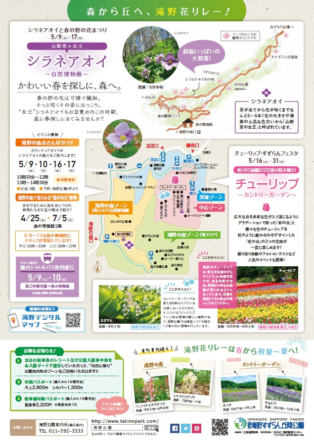 シラネアオイは日本の固有種で、北海道では絶滅危急種に指定されている。滝野の森ゾーンではもともと自生が確認されており、ボランティアによる保全活動によって個体数が増加してきた。期間中は見頃を迎えたシラネアオイのほか、さまざまな春の野の花が森を彩る。