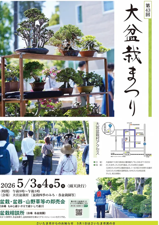 埼玉県さいたま市の大宮盆栽村にて、2026年5月3日から5日まで「大盆栽まつり」が開催されます。メイン会場は大宮盆栽村の「四季のみち」や各盆栽園の周辺、さいたま市大宮盆栽美術館などです。本イベントは国内外から注目されている、例年5月に開催される盆栽の祭典です。市民盆栽展、盆栽・盆器の即売会などが開催され、多くの愛好家でにぎわいます。