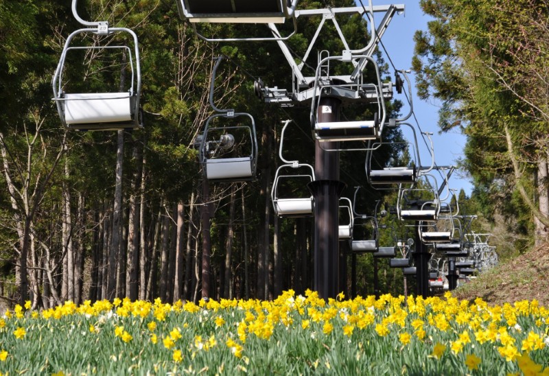 群馬スノーアライアンスが運営する「ノルンみなかみ」(冬季はノルンみなかみスキー場を営業)のスキー場の広大な斜面を埋め尽くす90種100万株のスイセンは、リフトから見下ろすことで「黄金色の絨毯」の上を歩いているような空中散歩を体験。