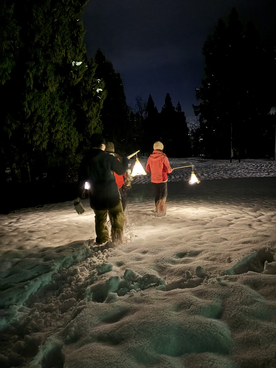 その後は防寒の服に着替えて、かんじきをはいたら、市販の懐中電灯の代わりに自分だけのランタンを手に、いよいよ魚沼の雪の森へ出発...! ガイドが同行するため、安全に配慮されたコースを安心して散策できます。ランタンの灯りを頼りに白い雪の上を進んでいきます。運が良ければ山の道中でウサギやキツネの足跡を発見できちゃうかも…!?