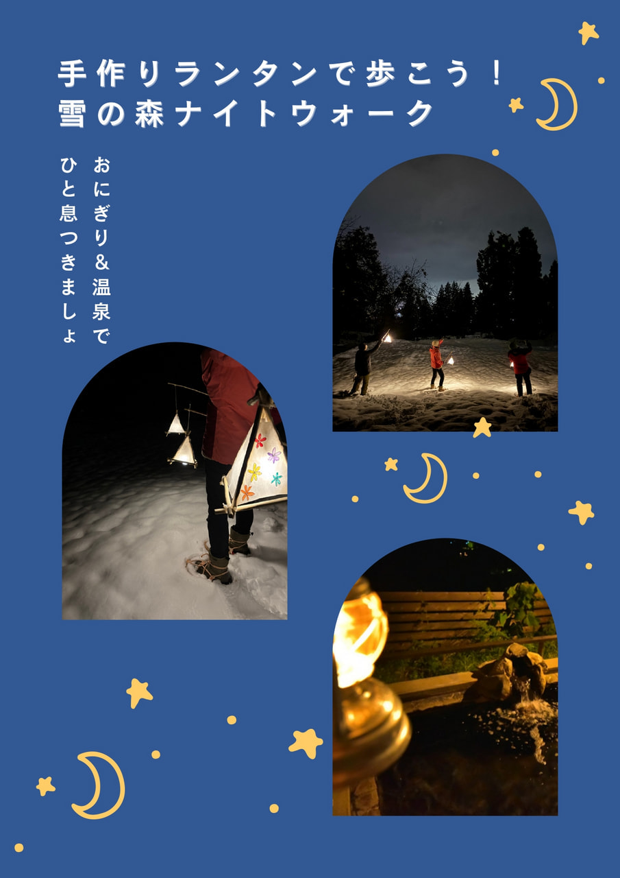 新潟県魚沼市にて、2025年12月29日〜2026年1月10日の期間「雪の森ナイトウォーク」ツアーが開催されます。新潟県魚沼市は、国内有数の豪雪地帯として知られていますが、雪がもたらすのは、厳しい冬の日常だけではありません。都会では決して味わえない、息をのむような絶景と特別な体験があります。このツアーでは、新潟県・魚沼市にある、標高262mの小さな里山「駒見山」の麓で、 木の枝と和紙を使った手作りランタンで足元を照らしながら、夜の「駒見山」周辺を探索します。雪の夜の森から帰ってきたあとは、地元食材を使った「おにぎり+味噌汁セット」を堪能し、最後は、温泉でリラックスするアクティビティツアーです。